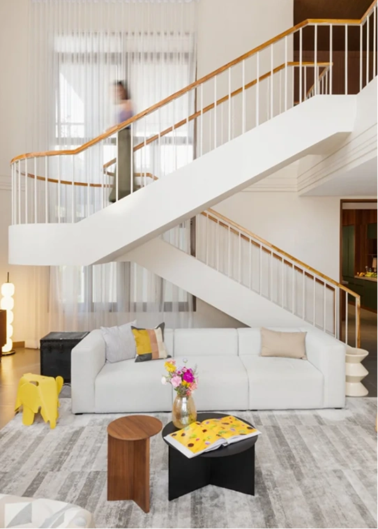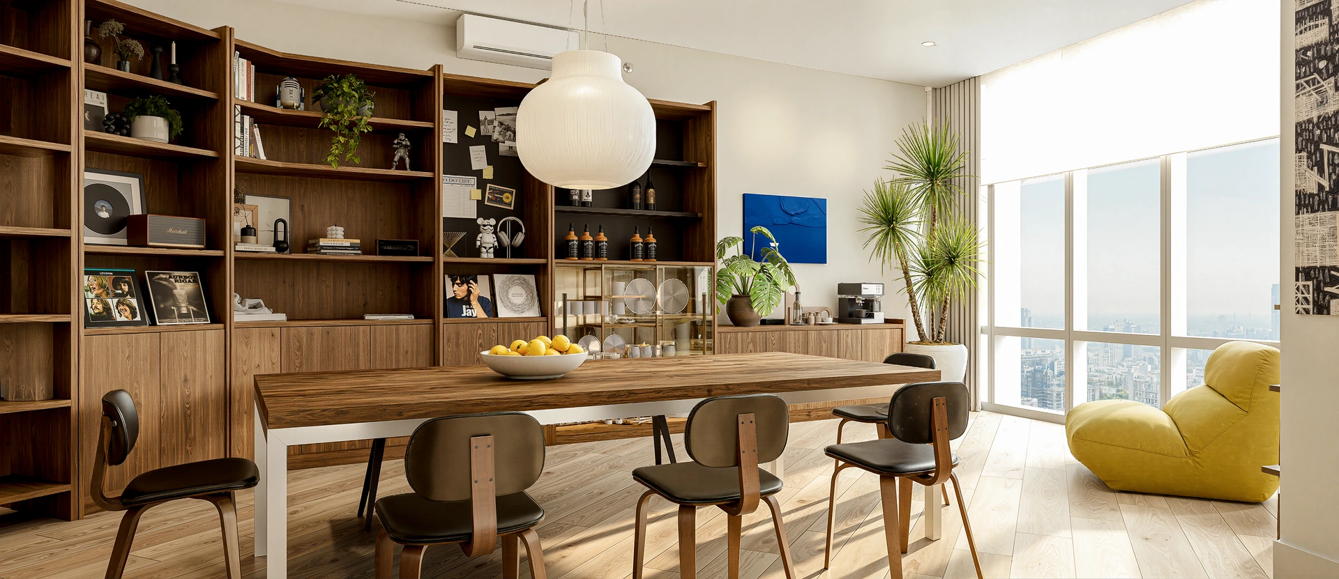 The living room became a convivial hub, with laughter and conversation flowing freely. A creative corner beckoned artists to sit and dream. Bright, filtered light danced across surfaces, illuminating curated pieces and warming the space. This modern mid-century home celebrated style, comfort, and family joy.